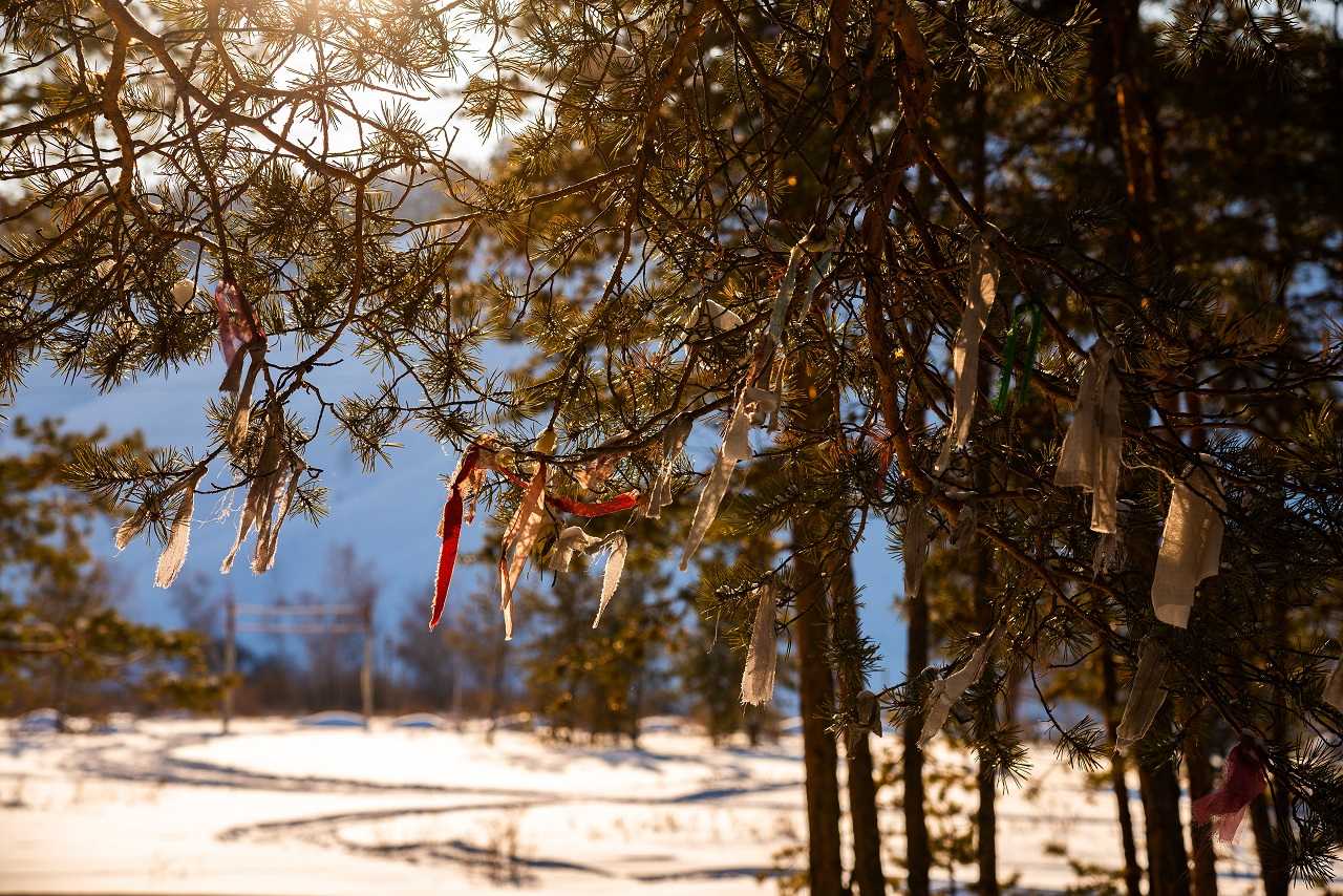 Проезжающие по трассе считают своим долгом повязать на шаман-дерево ленточку и оставить небольшой подарок духам. Заодно лентами оказываются украшены и десятки сосен и елей вокруг.
