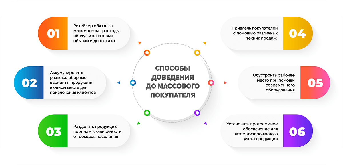 Главный принцип работы ритейла — перепродажа продукции конечному потребителю со своей наценкой. Цепочка поставки продуктов к покупателю выглядит так: