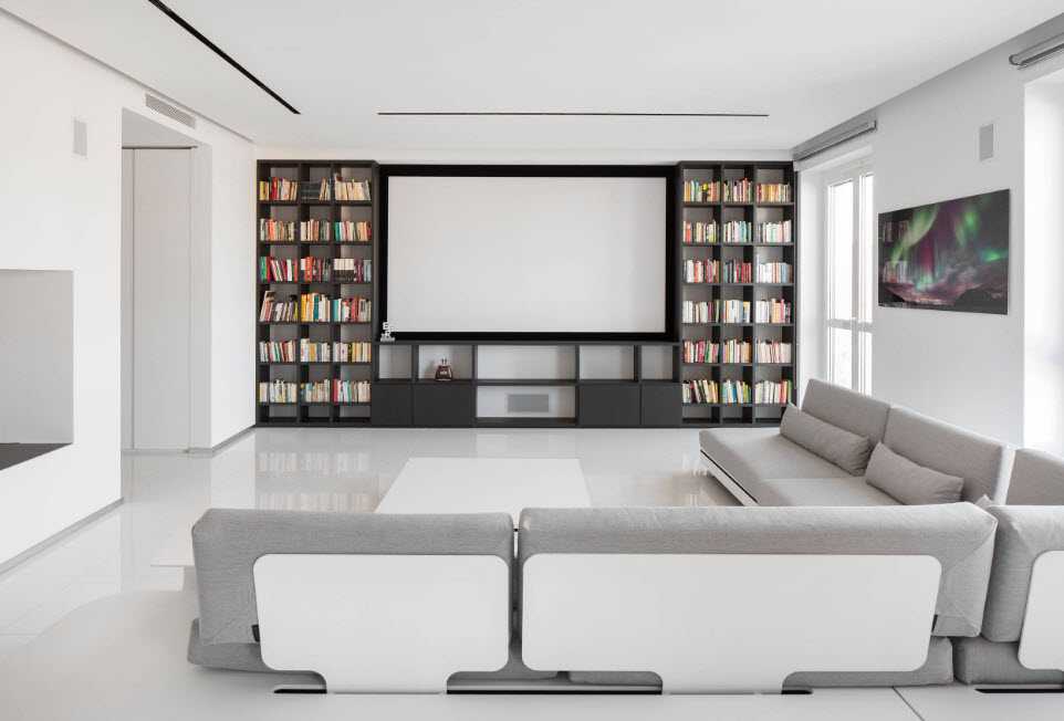 Возможно, кто-то удивится, но и белый цвет имеет широкую палитру. И поэтому гостиная, оформленная в таком цвете, не будет выглядеть как палата в больнице. Помните, что стенка в гостиную в стиле минимализм тоже может быть выполнена в белом цвете. Но тогда не лишними будут цветовые акценты.