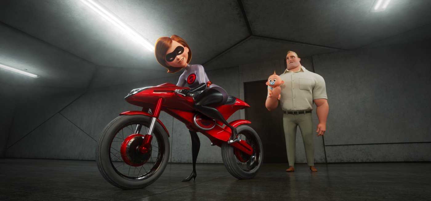Свет от мотоцикла отражается, как от реальной металлической поверхности. Мультфильм «Суперсемейка 2», 2018