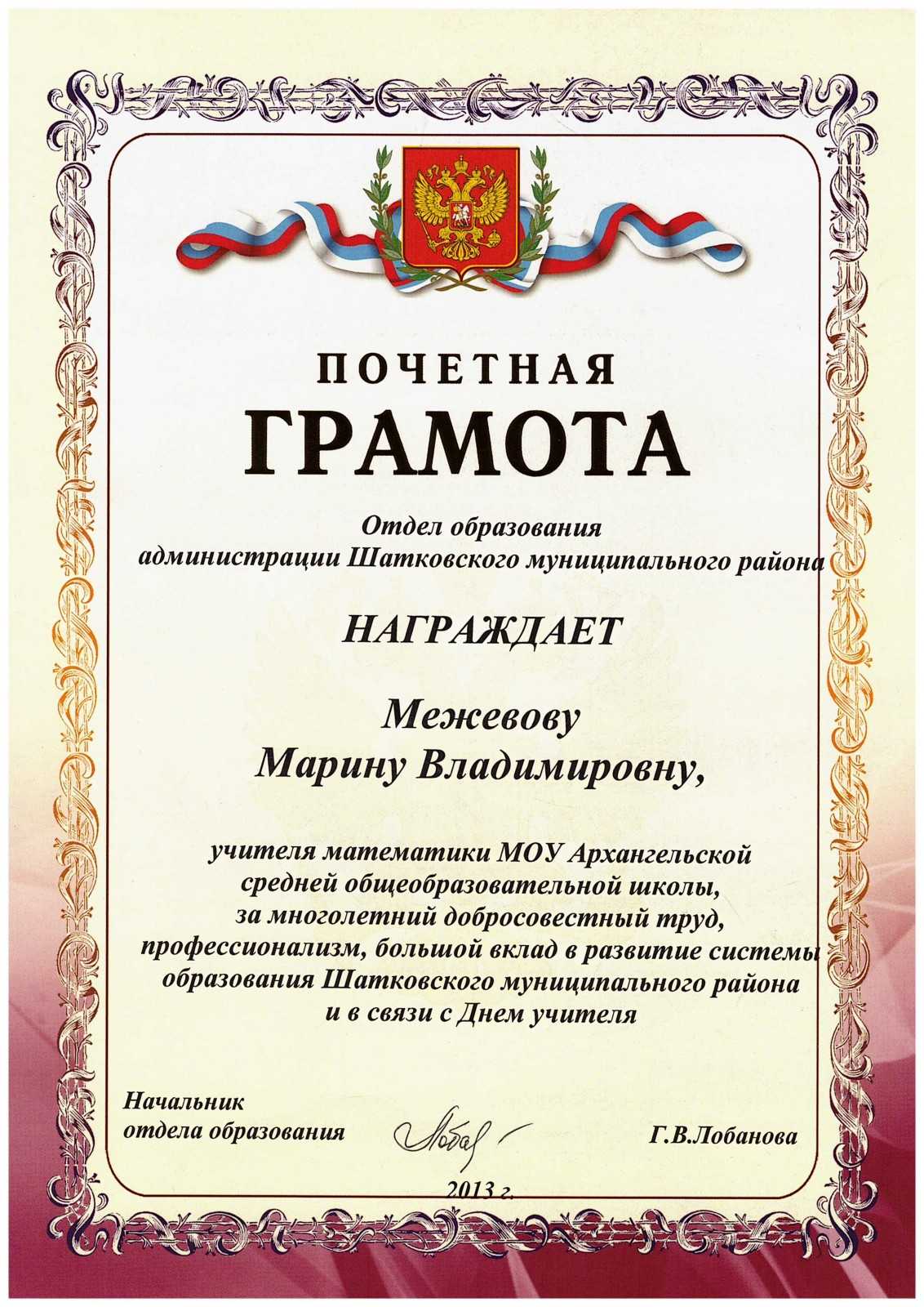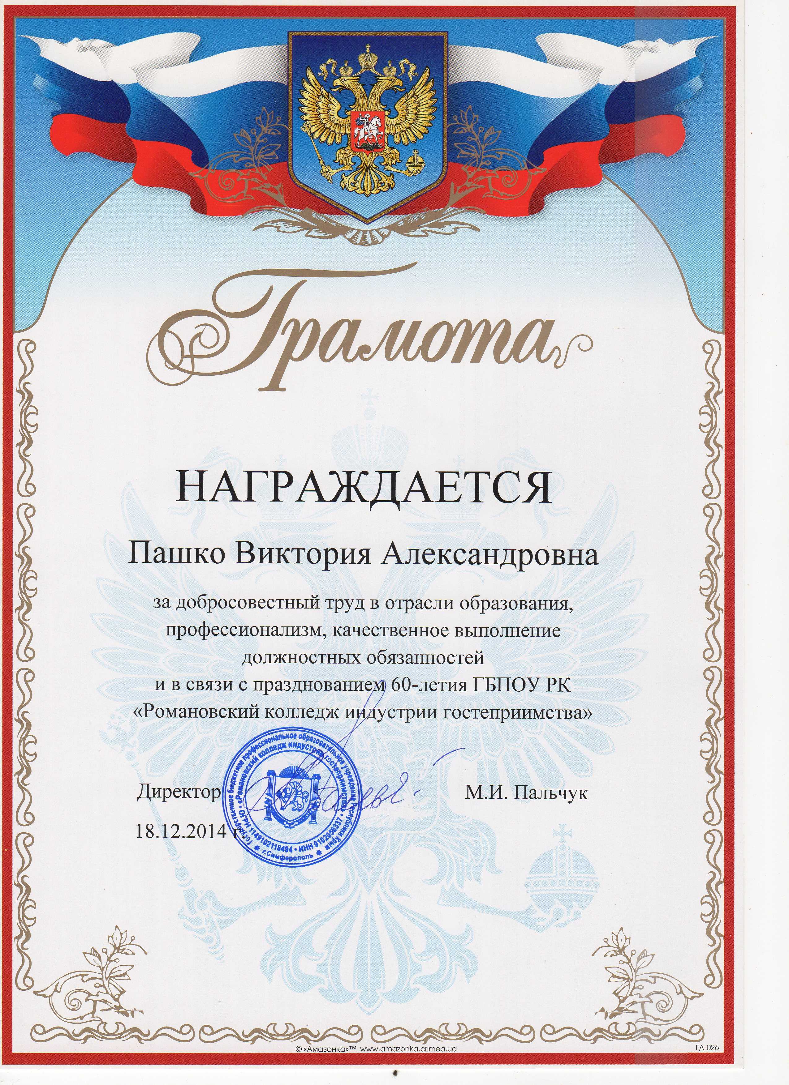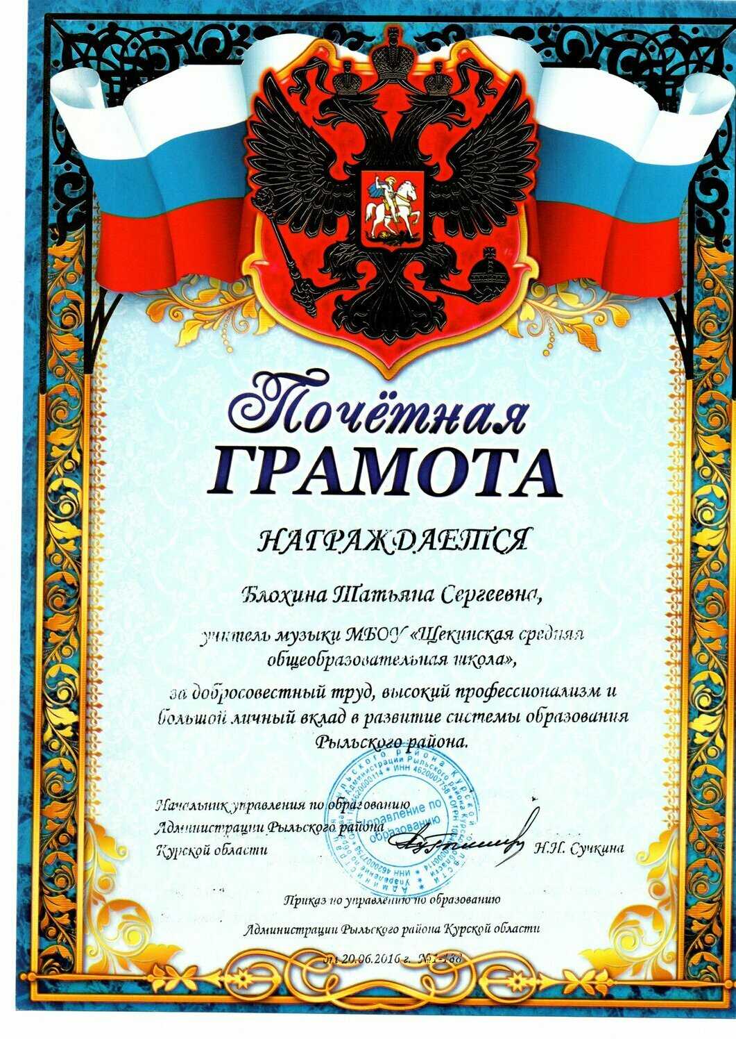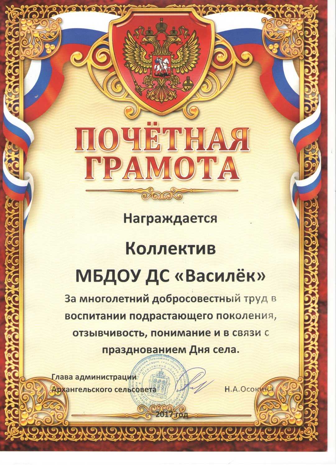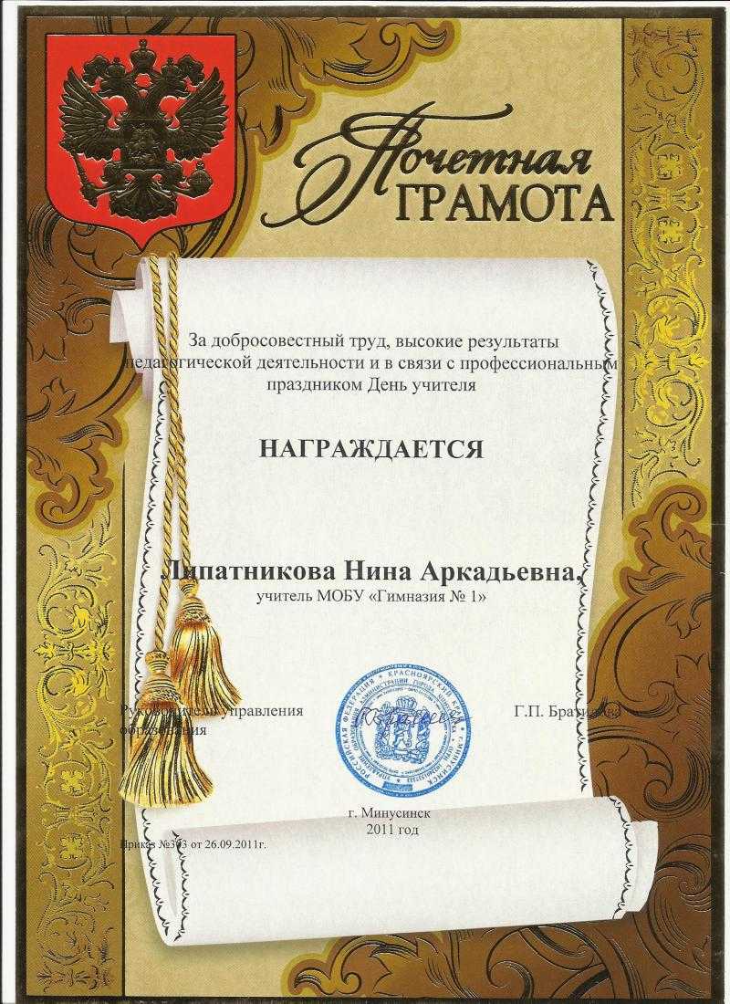- Вносится ли почетная грамота?