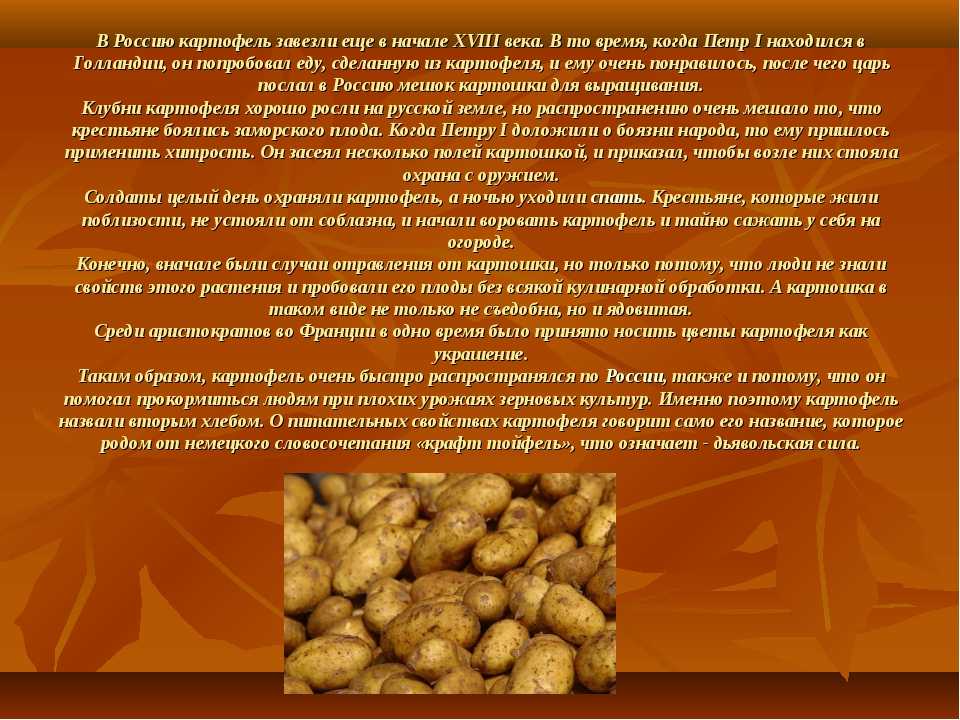 В Россию впервые картошку завез путешествующий по Европе молодой Петр I – большой любитель всевозможных новшеств. Сильные морозы погубили практически весь привезенный картофель. Пригодными для посадки осталось лишь 140 кг растения, которые решено было посадить в Москве. Желание не расставаться с привычной репой усиливалось стараниями старообрядцев, внушавшим простолюдинам, что употребление в пищу и выращивание на полях «чертова яблока» является страшным грехом. Смирившись и приняв всю неизбежность ситуации, крестьяне приступили к возделыванию своих огородов. Медленно, но уверенно картофель продолжал свое шествие по стране.
