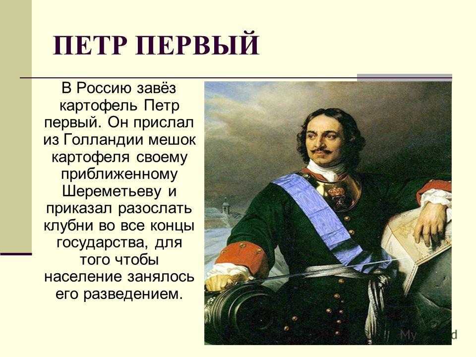 На территорию Российского государства картофель привозил Петр Первый. Царь, находящийся в Нидерландах, попробовал отварные клубни, приобрел картошку и передал ее графу Шереметьеву. Повара не знали, как правильно готовить овощ, поэтому подавали его к столу редко, предварительно припуская в кипятке и посыпая сахаром.