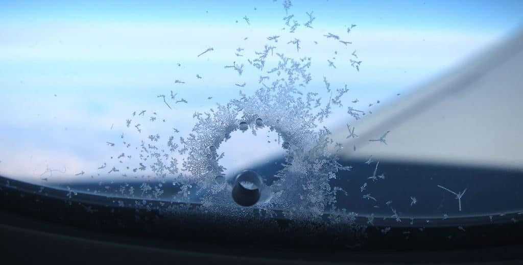 И все-же иногда за стеклом вокруг дырки в иллюминаторе самолета появляется ледовой узор. Он вызван конденсацией воды, происходящей вследствие контактирования холодного воздуха со стеклом (на большой высоте температура воздуха может составлять -20 С).