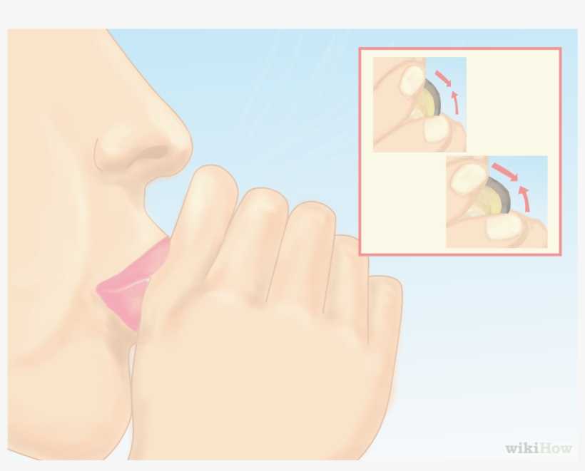 Два пальца помещаются в рот таким образом, чтобы губы могли сомкнуться над пальцами