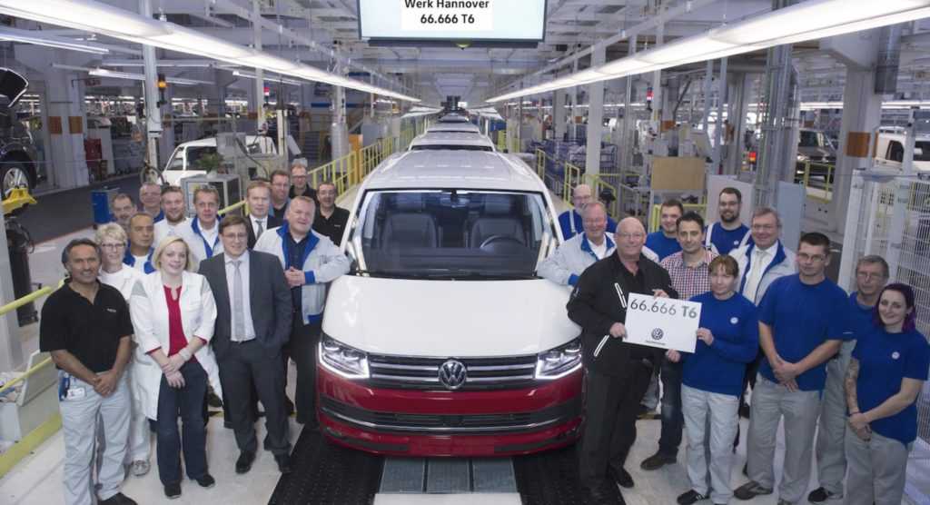 На фото ниже сотрудники Volkswagen в Ганновере радуются выпуску сошедшего с конвейера 66.666-му автомобилю марки Т, выполненному в бело-красных тонах (на данный момент снимок затерт в поисковиках).