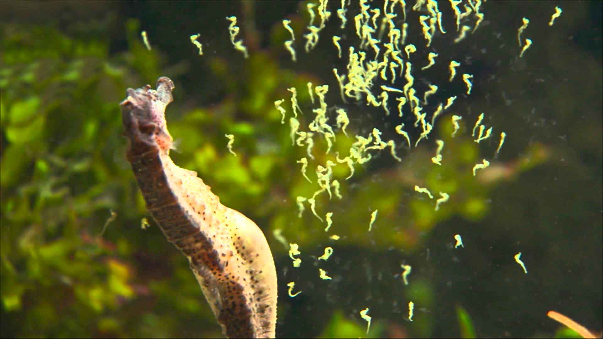 Когда икринки достигают нужной стадии, самки начинают соревноваться друг с другом за мужское внимание. Добившаяся расположения самка откладывает часть икры в специальный мешок, который расположен на животе самца