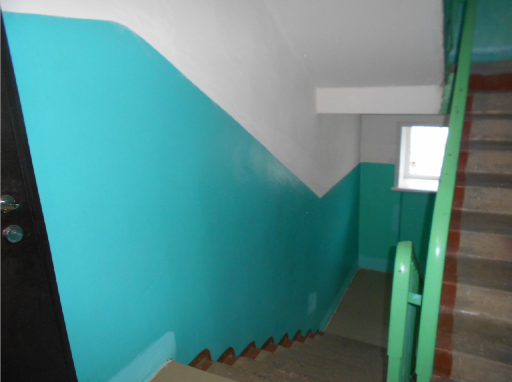 На лестничных пролетах, а первоначально и в квартирах, стены красили синей либо зеленой краской, причем до половины. Верхняя часть просто покрывалась побелкой, как и потолок.