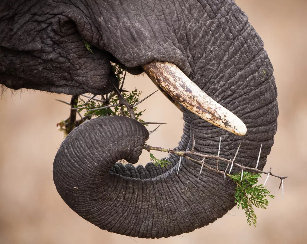 Хобот слона, наполненный более чем 40000 мышц, мощный и чрезвычайно чувствительный. Слоны используют свои цепкие хоботы, чтобы чувствовать запах, есть, дышать под водой, издавать звуки, очищаться и защищаться. У слонов есть «пальцы» на кончиках хоботов – у африканских слонов их два, а у азиатских – один, – которые позволяют им поднимать крошечные предметы. Обладая огромной ловкостью, слоны могут соединять хоботом мелкие материалы, например, зерна. ()