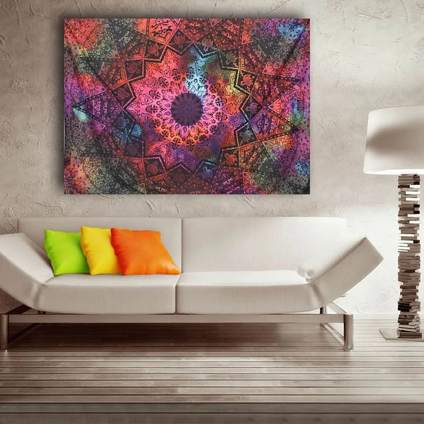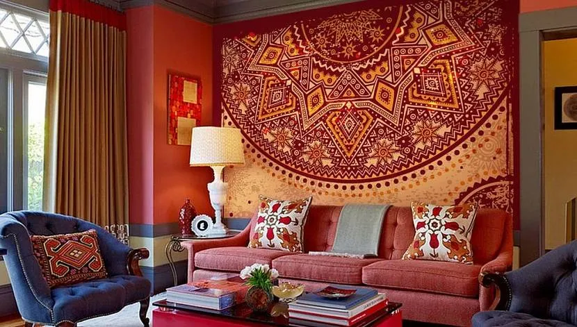Оформляя комнату в индийском или арабском стиле, украсть её ярким ковром с витиеватым орнаментом. Лучше всего в такой интерьер впишутся изделия, сделанные вручную. В комнате можно развесить несколько ковров одновременно. Ещё один оригинальный способ украсить помещение – это полностью закрыть одну стену ковром сверху донизу.