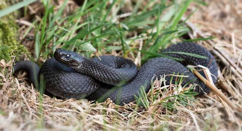 - Внешний вид змеи и черной гадюки разный, несмотря на одинаковый цвет кожи. У обыкновенной змеи на голове есть 2 желтых или оранжевых пятна, похожих на миниатюрные уши, а у гадюки таких отметин нет.