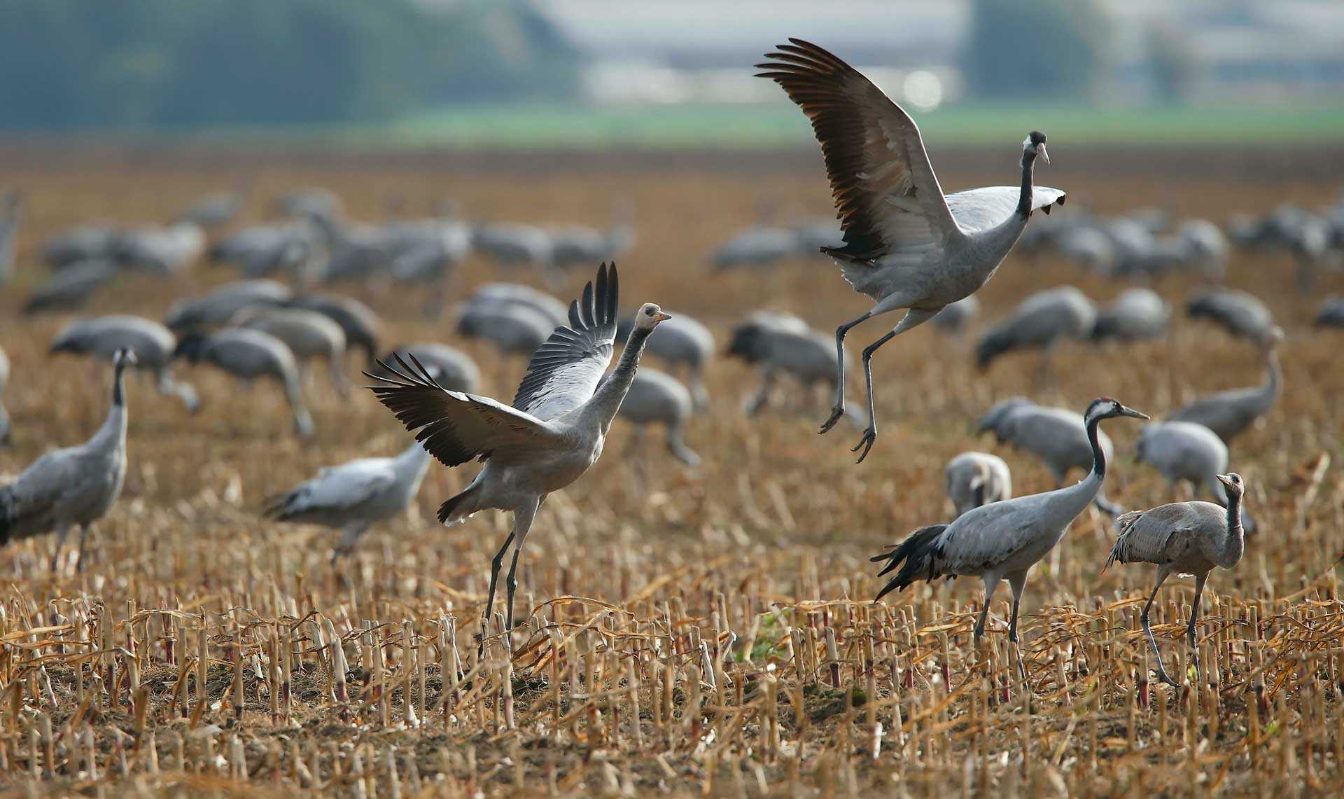 Также страдают и зерноядные птицы, которым трудно отыскать посреди снега семена и травы. Популярными травоядные птицы — журавли, которые предпочитают готовиться к отлёту ещё в начале осени. Собираясь в стаи, теплолюбивые журавли оповещают о своём отлёте людей гортанным криком . Однако не все журавли покидают родные края, а только те, кто обитает в северных районах России.