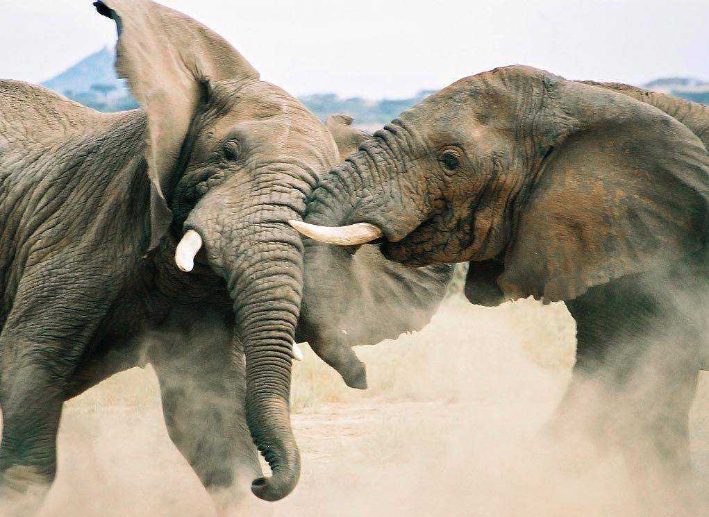 Слон обладает также силой и мастерством в битии. Он может использовать свои бивни для защиты, атаки и сбивания деревьев. Важная часть их повседневной жизни состоит в ритуальных поединках между молодыми самцами.