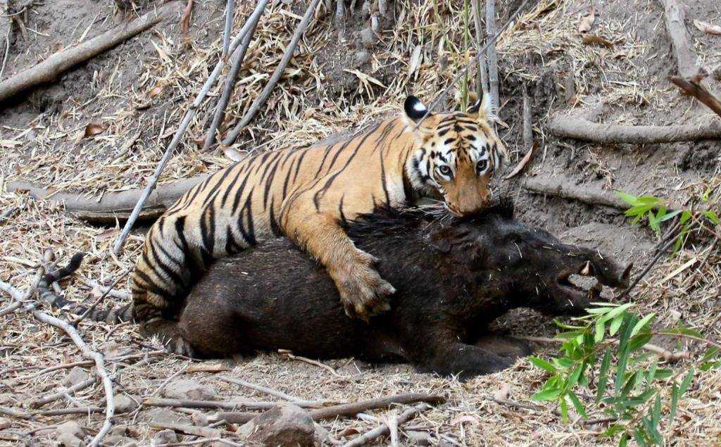 Если охота тигра была неудачной, а жертва оказалась сильнее или убежала, то повторно тигр не нападает. Хищники едят добычу лежа, придерживая мясо лапами.