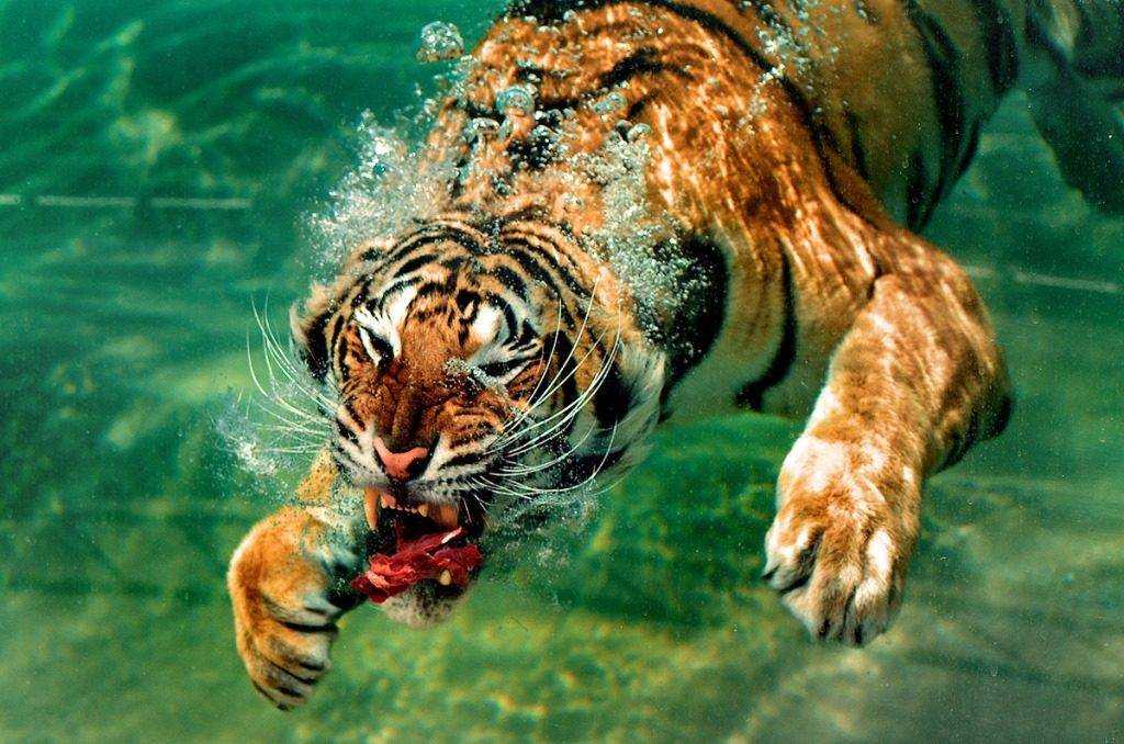 Нередко в рационе питания хищника присутствует мясо фазанов, лосей, обезьян, зайцев, а порой и рыбы. Если животное сильно голодает, может употреблять в пищу лягушек, мелких грызунов, даже ягоды и плоды некоторых растений. Известны также случаи, когда тигры охотились и на других хищников, например, волков, крокодилов, леопардов и даже медведей. Однако в большинстве случаев на крупных животных тигр старается не охотиться. Так, Бенгальские тигры довольно удачно ловят болотных крокодилов. Дикая кошка знает, что проще всего ухватить рептилию за наиболее мягкое место – живот. Охотясь, тигр пытается сначала дезориентировать крокодила, затем перевернуть его на спину, чтобы когтями разорвать брюхо.