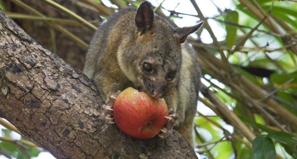 Кузу. Еще один сумчатый представитель, который живет на деревьях, обвивая цепкий хвост вокруг веток. В рацион этого стайного животного входит кора, листья, соцветия, а иногда и содержимое птичьих яиц.
