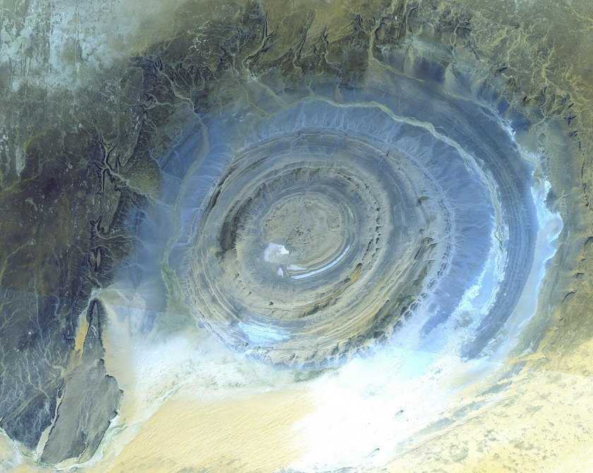 Еще один хороший пример фальшивой астроблемы – «Глаз Сахары», кольцевая структура Ришат, диаметром 50 км в Мавритании. Изначально считалось, что Ришат – типичный ударный кратер, но плоская форма дна и отсутствие пород с ударным воздействием опровергают эту идеи. По текущей версии, своей формой структура обязана эрозии осадочных пород.