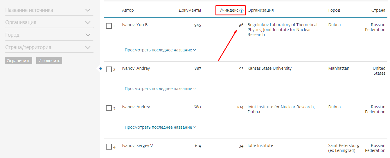 Где посмотреть индекс Хирша, несложно понять после нажатия на кнопку Search. Однако при применении такого варианта поиска научных публикаций в Скопус, появляется большое количество документов, не представляющих практического интереса.