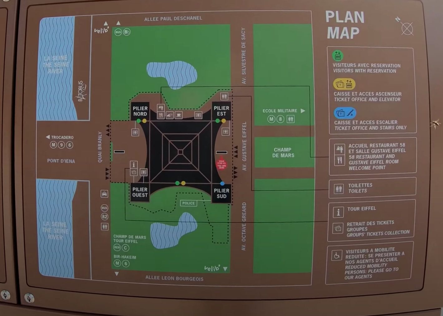 Еще можно воспользоваться услугами водного трамвайчика Батобус, работающего по принципу городского транспорта. Причал «Batobus Tour Eiffel» находится в 2-х минутах от конечной точки.