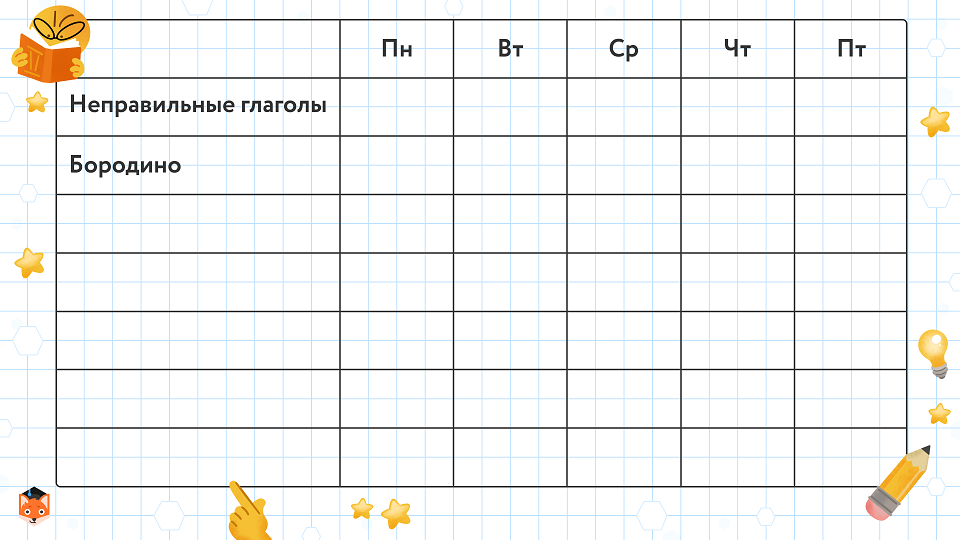 Перехитрить собственную память и не забывать информацию можно только при системном подходе. На повторение изученного материала необходимо выделять время, а лучше вести дневник. В первую колонку можно записать всё, что нужно выучить: например, неправильные глаголы, «Бородино». А в столбиках дней ставить «+» или «–» в зависимости от того, повторил ребёнок тему или нет.