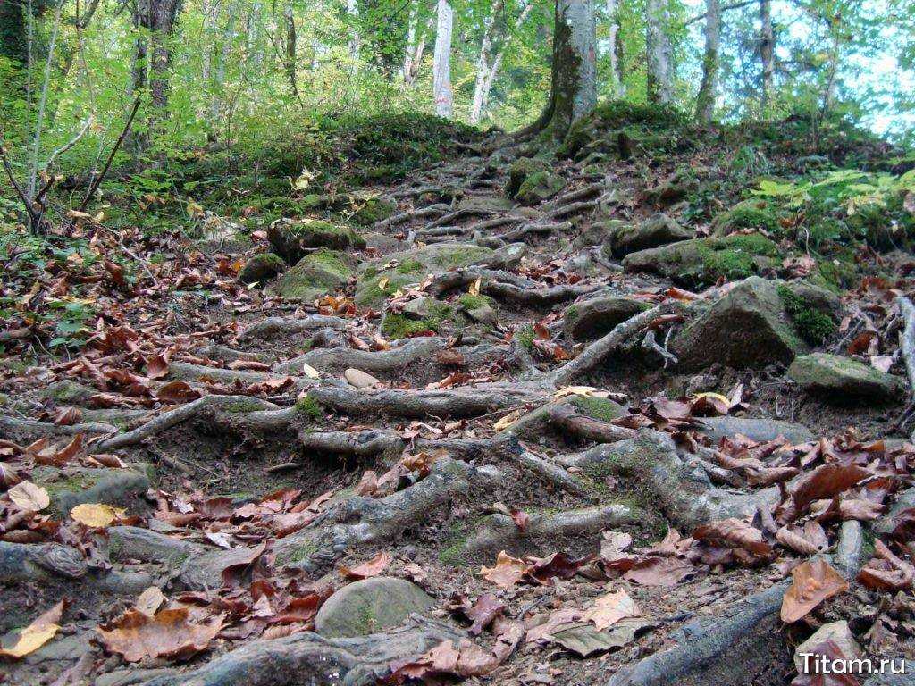 Чтобы спуститься к водопадам, нужно будет от дороги пойти по тропинке влево вниз. Спуск довольно крутой, под ногами земля и корни деревьев.